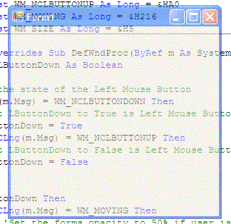 Click here to see a screenshot of this code!Make Form Transparent on Move and Resize
